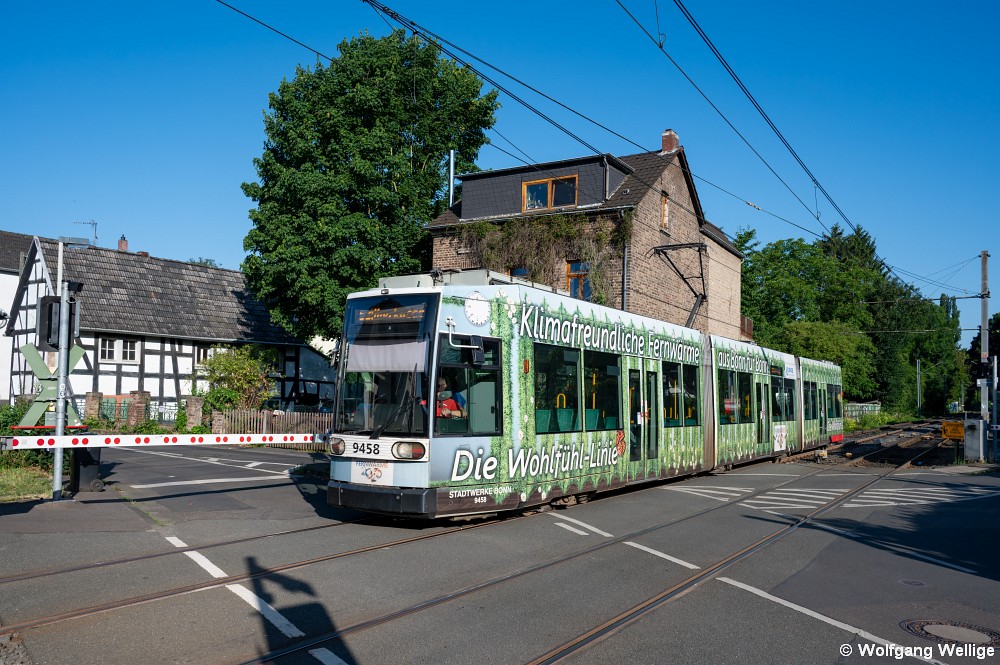 Der mit einer Werbung für Fernwärme beklebte Wagen 9458 befährt am 30. Juni 2025 den Bahnübergang vor der Station Oberkassel Mitte