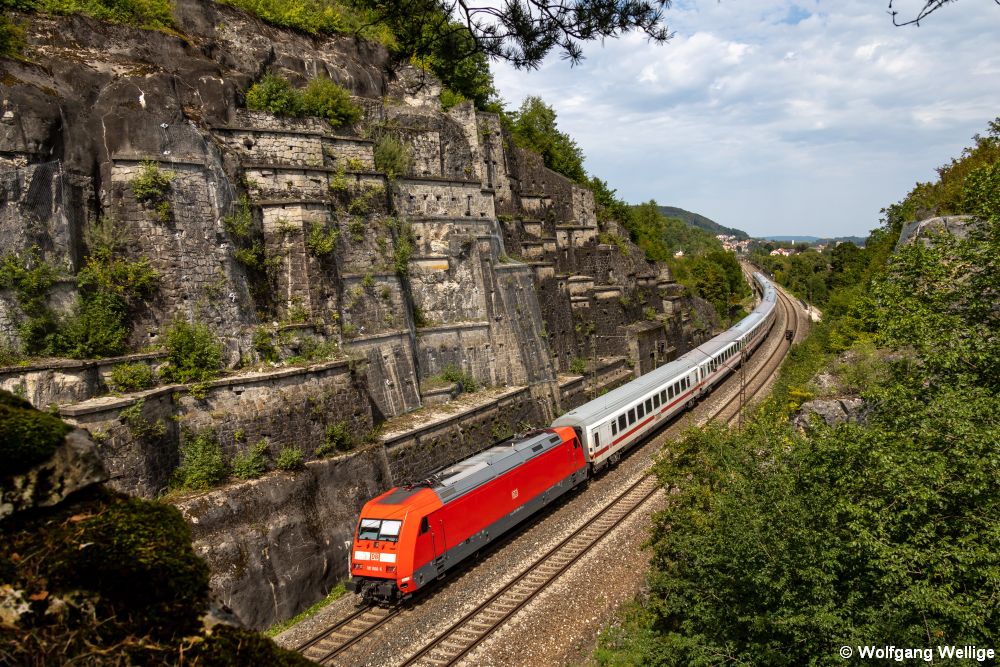 101 006 passiert mit den bis Augsburg vereinigt fahrenden IC 2083 von Hannover nach Freilassing und IC 2085 nach Oberstdorf am 15.08.2023 die imposante Stützwand kurz hinter Treuchtlingen