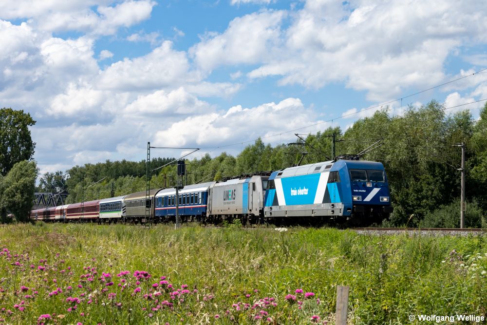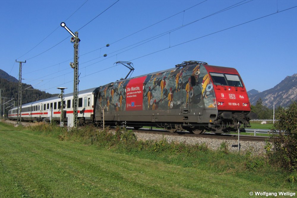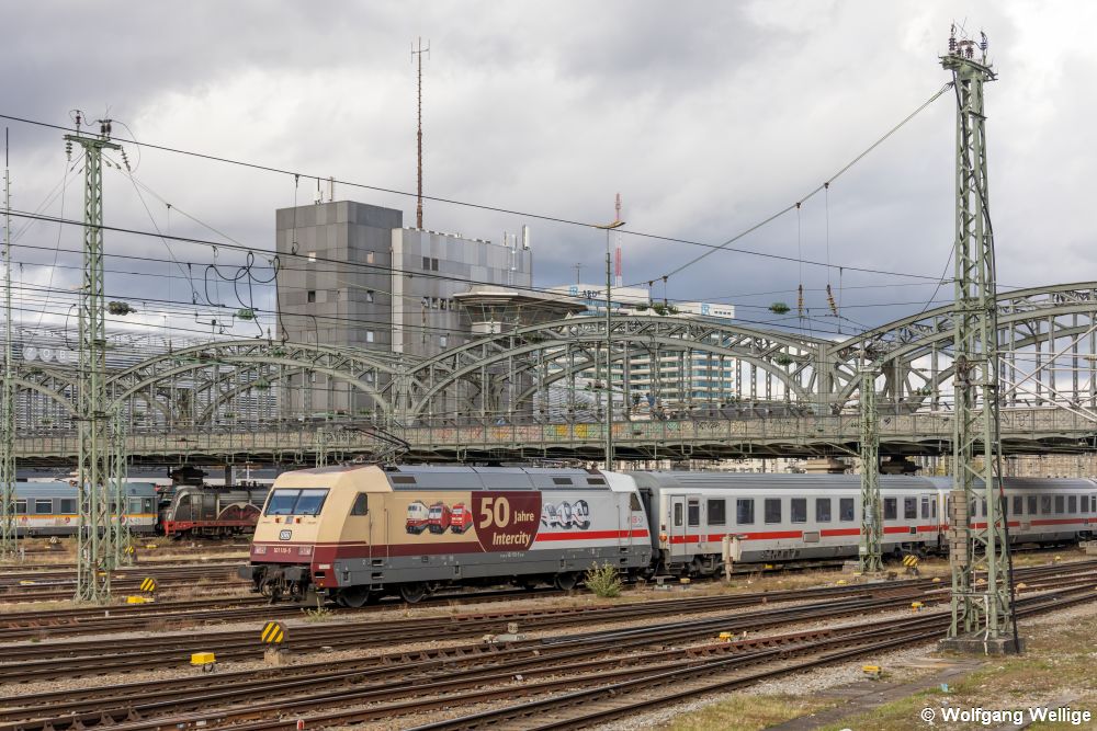 101 110 wurde anlässlich des Jubiläums '50 Jahre Intercity' Ende 2021 je zur Hälfte in den historischen und aktuellen IC-Farben gestaltet und mit Abbildungen der wichtigsten Fahrzeuge dieser Zuggattung versehen. Am 11.04.2023 unterquert die Lok mit EC 216 (Graz - Saarbrücken) die Hackerbrücke nahe des Münchner Hauptbahnhofs.