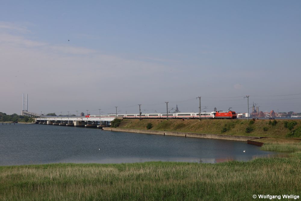 Auf dem Rügendamm, der die Insel Rügen mit der Stadt Stralsund auf dem Festland verbindet, entstand am 13. Juni 2020 die Aufnahme des im 'Sandwich# von zwei Loks der Baureihe 101 bespannten IC 2213 (Ostseebad Binz - Stuttgart Hbf).
