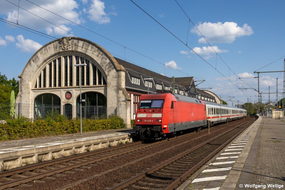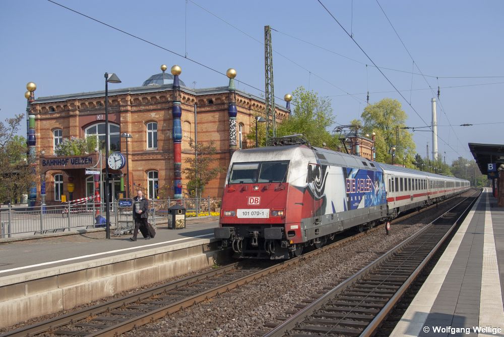 Zwei Unikate auf einem Bild: Der vom Wiener Künstler Friedensreich Hundertwasser gestaltete Bahnhof Uelzen und die für den Eishockey-Club Adler Mannheim werbende 101 070 vor dem IC 2371 Hamburg-Altona - Konstanz (23. April 2009)