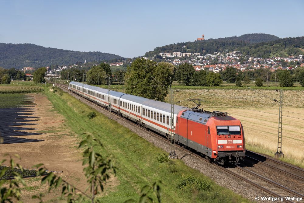 101 040 befährt am 10. August 2023 mit IC 1291 (Frankfurt (Main) - Salzburg) die Main-Neckar-Bahn zwischen Frankfurt und Heidelberg, aufgenommen bei Heddesheim/Hirschberg.