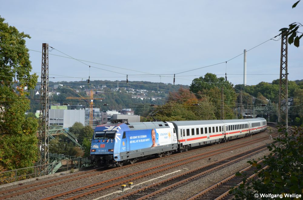 Die mit einer Werbebeklebung für 'Schauinsland Reisen' versehene 101 055 zieht am 11. Oktober 2016 den IC 2044 (Dresden Hbf - Köln Hbf) durch Wuppertal, aufgenommen nahe des S-Bahnhaltepunktes Wuppertal-Sonnborn.