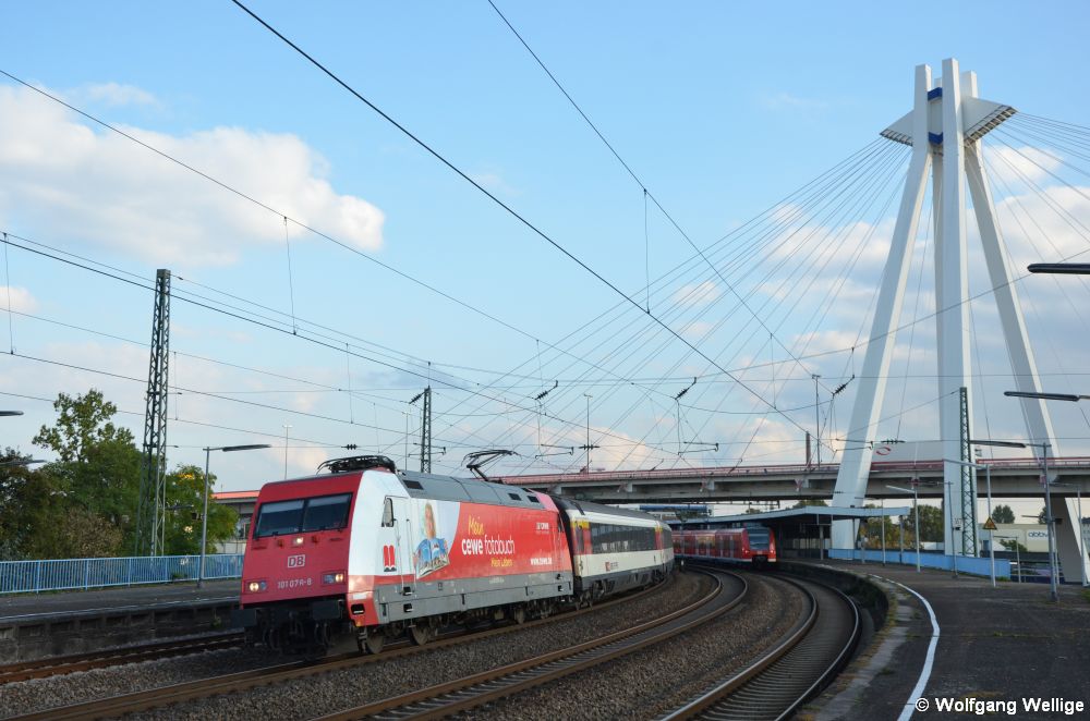 Die für das 'cewe-Fotobuch' werbende 101 076 durchfährt am 12. Oktober 2016 mit dem aus der Schweiz kommenden EuroCity 6 (Interlaken Ost - Hamburg-Altona) den Hauptbahnhof der Stadt Ludwigshafen mit der markanten, die Gleise überspannenden Straßenbrücke.