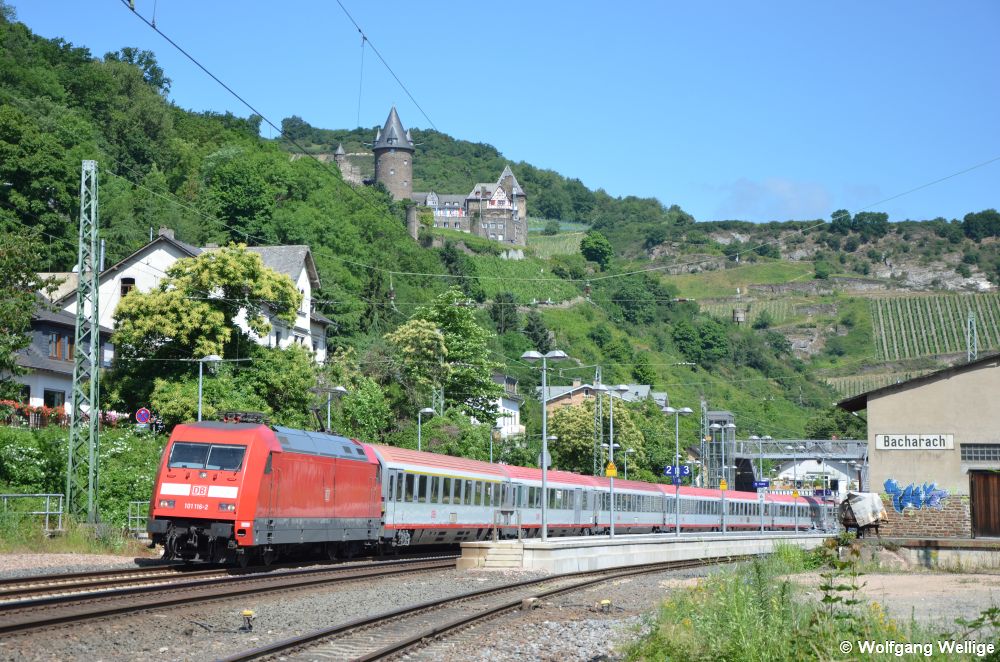 101 116 durchfährt am 24. Juni 2017 mit dem aus österreichischen Wagen gebildeten IC 119 von Münster (Westfalen) nach Innsbruck den Bahnhof Bacharach an der linken Rheinstrecke, im Hintergrund ist die Burg Stahleck zu sehen.