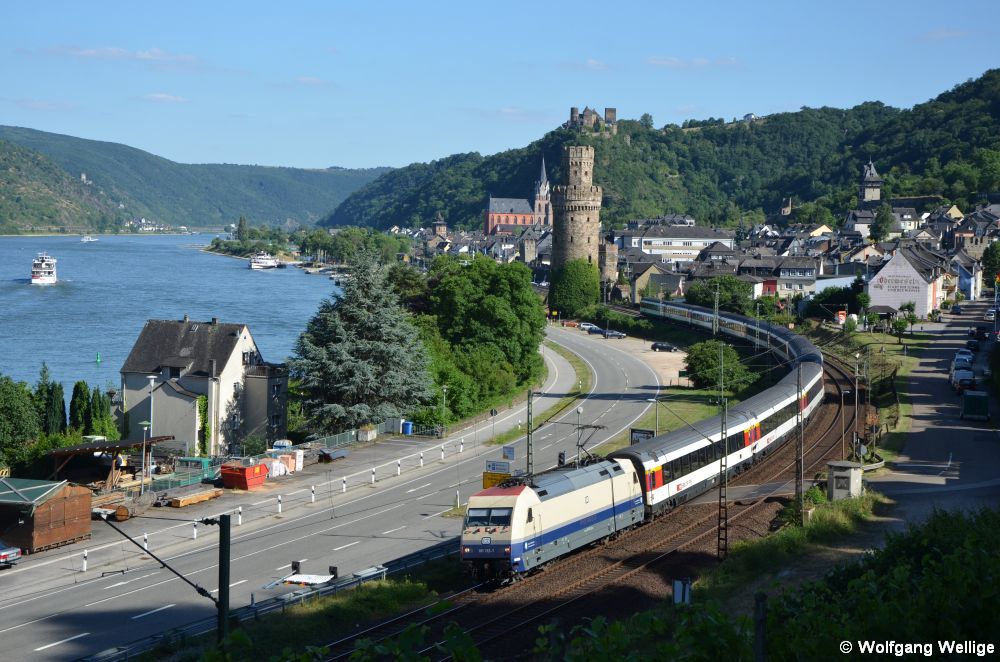 Auf der linken Rheinstrecke fährt die passenderweise mit einer 'Rheingold'-Beklebung versehene 101 112 am 24. Juni 2017 mit EC 6 (Interlaken Ost - Dortmund Hbf) durch das Städtchen Oberwesel mit seiner mittelalterlichen Stadtbefestigung