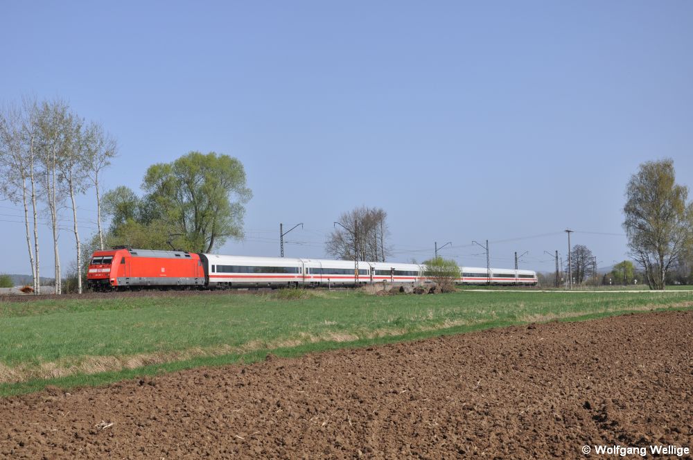 101 126 hat am 10. April 2011 bei Baiersdorf (zwischen Bamberg und Nürnberg) die ehemalige 'Metropolitan'-Garnitur als ICE 915 (Berlin-Gesundbrunnen - München Hbf) am Haken. Dieser Zug verkehrte vor seiner Umlackierung in silbergrauer Farbgebung als Luxuszug zwischen Köln und Hamburg.