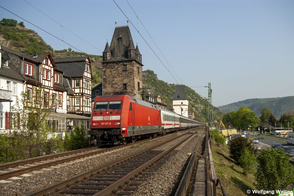 101 127 zieht EuroCity 7 von Hamburg nach Chur in der Schweiz am 15. April 2009 durch das mittelalterliche Städtchen Bacharach am Rhein mit seinem Marktturm