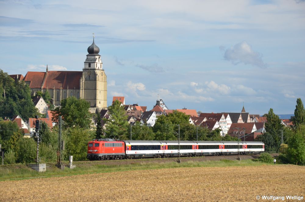 Eine 'Kasten-110er', genauer die seit 2006 auf die Baureihenbezeichnung 115 umnummerierte 115 114, hat am 24. August 2014 mit IC 184 (Zürich HB - Stuttgart Hbf) gerade Herrenberg durchfahren. Im Hintergrund ist die Stiftskirche Herrenberg zu sehen, das Wahrzeichen der Stadt.