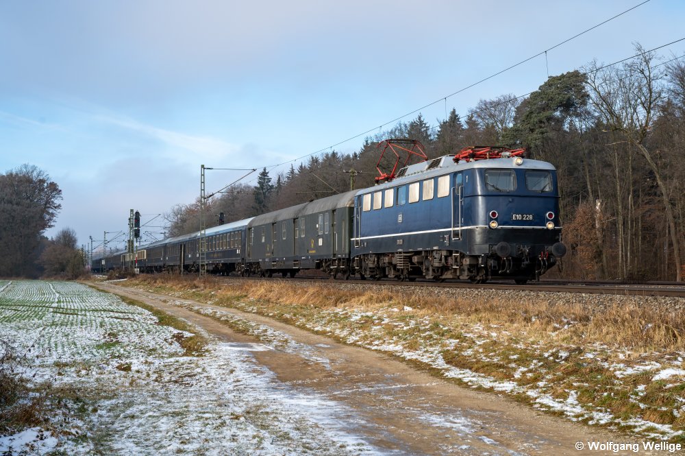 Die Museumslok E10 228 der GfE (Gesellschaft für Eisenbahnbetrieb, Crailsheim) befördert am 27. Dezember 2025 den 'Classic Courier' als DZ 1798 von Bietigheim-Bissingen über Stuttgart und München nach Salzburg, aufgenommen bei Zorneding.