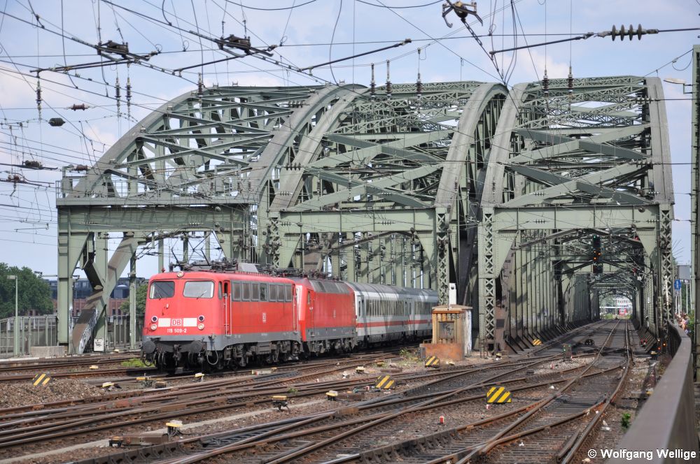 115 509 hat am 6. Juni 2011 gerade einer Lok der Baureihe 120 auf der Hohenzollernbrücke über den Rhein geholfen und erreicht gleich den Kölner Hauptbahnhof