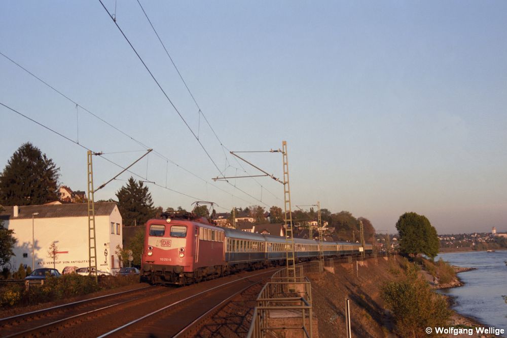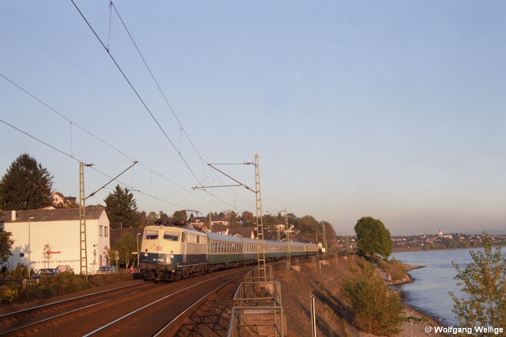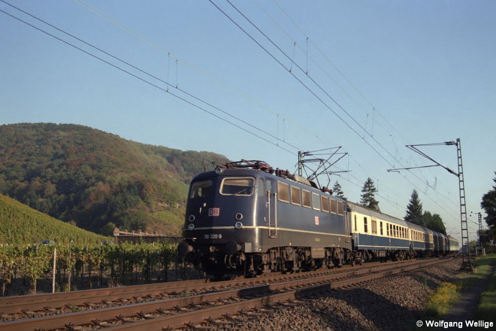110 320 trägt noch die ursprüngliche, blau-schwarze Lackierung als sie am 19.10.1997 mit einem Regionalexpress die Rechte Rheinstrecke von Koblenz nach Köln entlangfährt. Die Aufnahme entstand bei Leutesdorf.