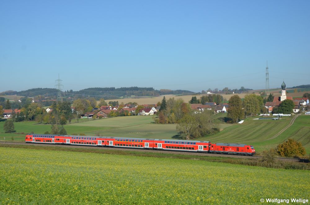 245 012 der Südostbayernbahn bespannt am 14. Oktober 2017 die Regionalbahn 27025 von München nach Mühldorf (Oberbayern), aufgenommen in der herbstlichen Landschaft wenige Kilometer vor dem Bahnhof Dorfen.