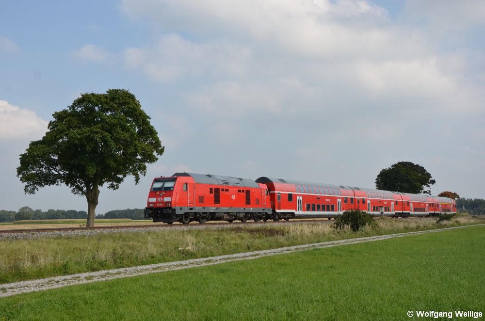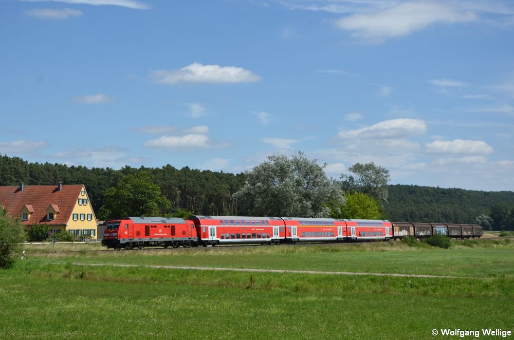 245 013 der Südostbayernbahn absolviert am 29. Juli 2017 einen Dienst fernab ihres Einsatzgebietes: Zur einmal im Jahr stattfindenden Radltour des Bayerischen Rundfunks bringt sie den Sonderzug RC-D 27007 von Aschaffenburg nach Gunzenhausen, der Zug führt neben drei Doppelstockwagen auch sechs Güterwagen für die vielen Fahrräder. Die Aufnahme entstand bei Langlau.