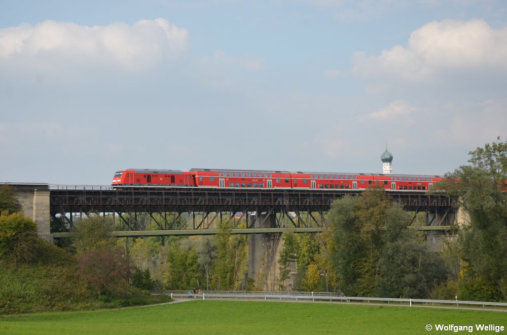 245 005 rumpelt mit RE 57515 von München nach Füssen am Haken am 23.09.2017 über die zu diesem Zeitpunkt noch nicht mit Oberleitungen versehene Lechbrücke bei Kaufering