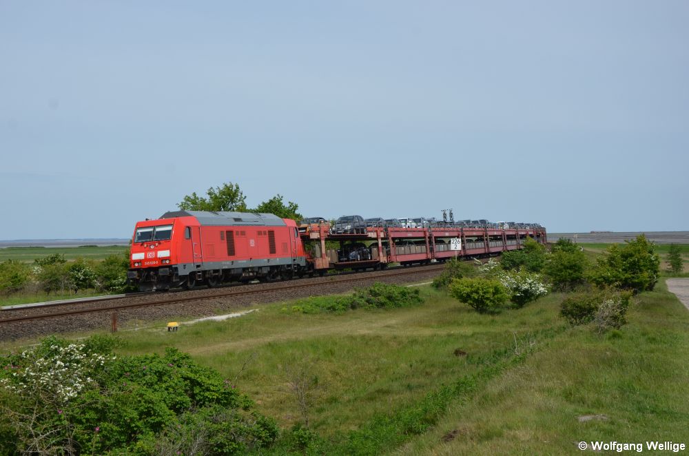 245 026 hat mit dem Autozug 'Sylt Shuttle' (Niebüll - Westerland) nach der Überfahrt des Hindenburgdammes gerade bei Morsum die Insel Sylt erreicht (21.05.2018)