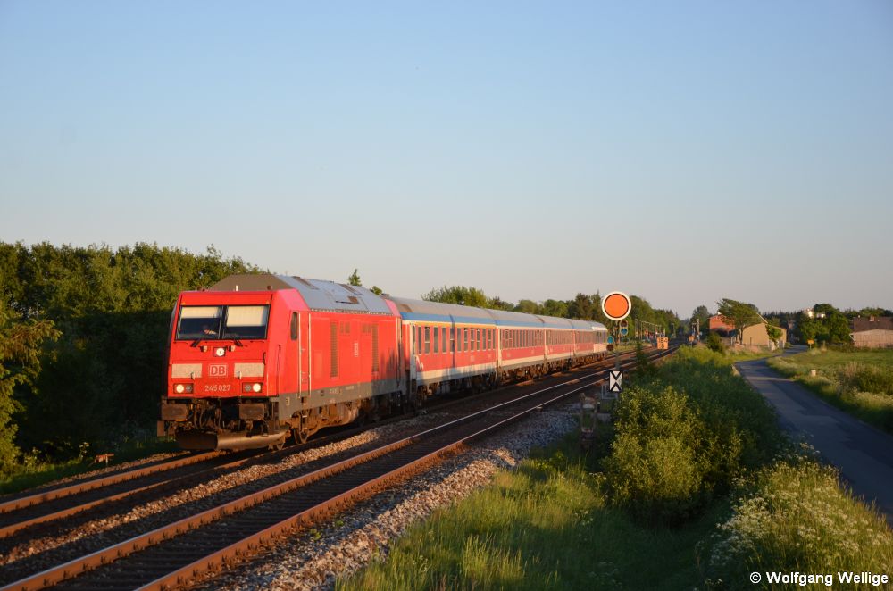 245 027 bringt am Abend des 20. Mai 2018 die aus ehemaligen InterRegio-Wagen Ersatzwagengarnitur als RE 11028 von Hamburg-Altona nach Westerland (Sylt), aufgenommen am Einfahrvorsignal von Langenhorn (Schleswig).