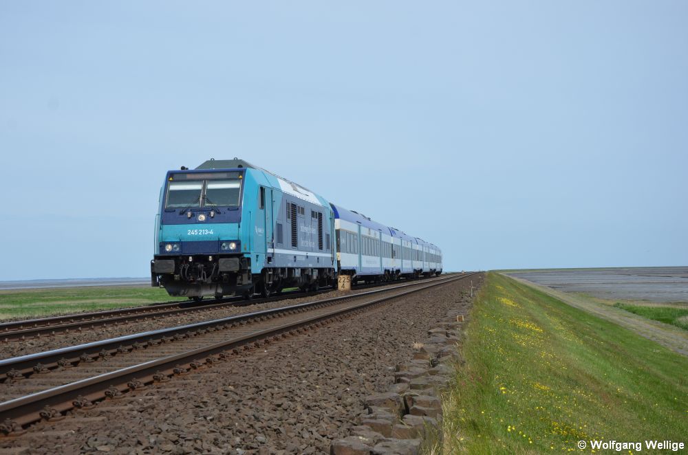 Die in der schleswig-holsteinischen Regionalfarbgebung lackierte 245 213 kommt am 21. Mai 2018 mit dem RE 11014 von Hamburg-Altona nach Westerland über den Hindenburgdamm auf die Insel Sylt gefahren