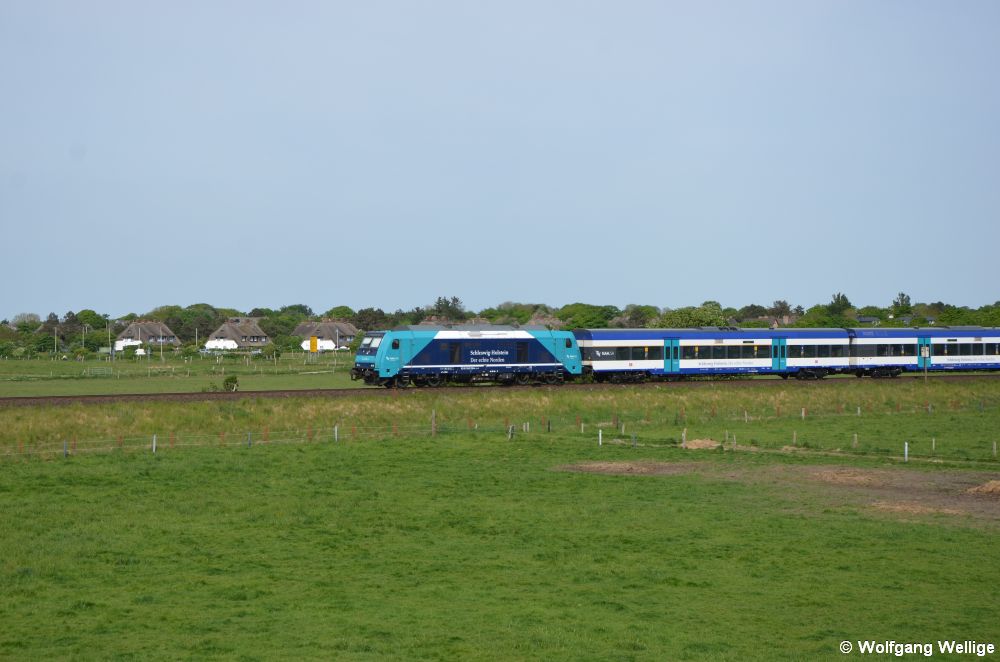 Die im Farbschema der Schleswig-Holsteinischen Landesnahverkehrsgesellschaft 'NAH.SH' lackierte 245 208 der DB zieht am 21. Mai 2018 den RE 11018 von Hamburg-Altona nach Westerland (Sylt) an einigen landestypischen Häusern bei Keitum vorbei