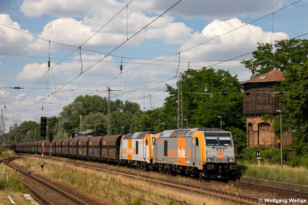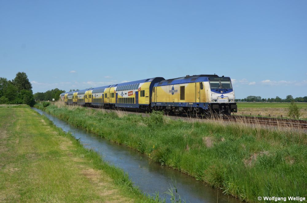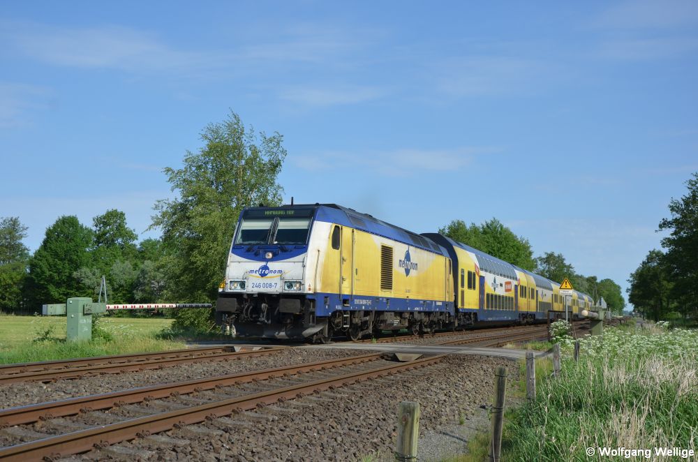 Ein 'Metronom'-Doppelstockzug mit 246 008 an der Spitze ist am 23.05.2018 als RE 5 kurz hinter Wingst auf dem Weg von Cuxhaven nach Hamburg. Im Dezember 2018 endete der Verkehrsvertrag des Metronom auf dieser Strecke und die DB-Tochter 'Start' übernahm die Züge.