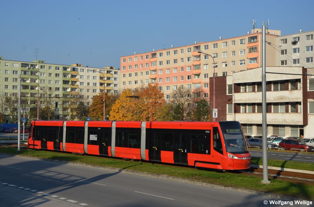 Wagen 7515 fährt am 31.10.2015 durch das Plattenbauviertel nahe der Station OD Saratov (Obchodný Dom Saratov = Kaufhaus Saratov)