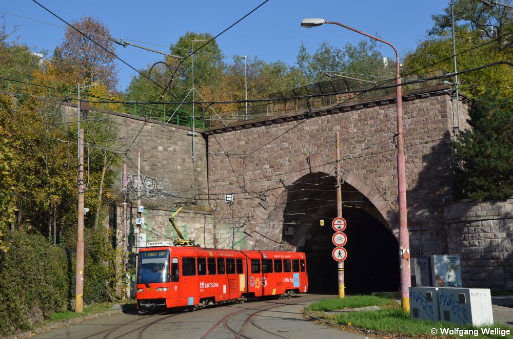 Der Tatra-K2 Wagen Nummer 7105 kommt am 31. Oktober 2015 als Linie 1 aus dem Südportal des knapp 800 Meter langen Burgbergtunnels (Tunnel unter der Burg Bratislava) nahe der Haltestelle Chatam Sófer gefahren