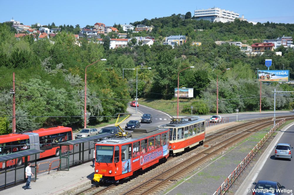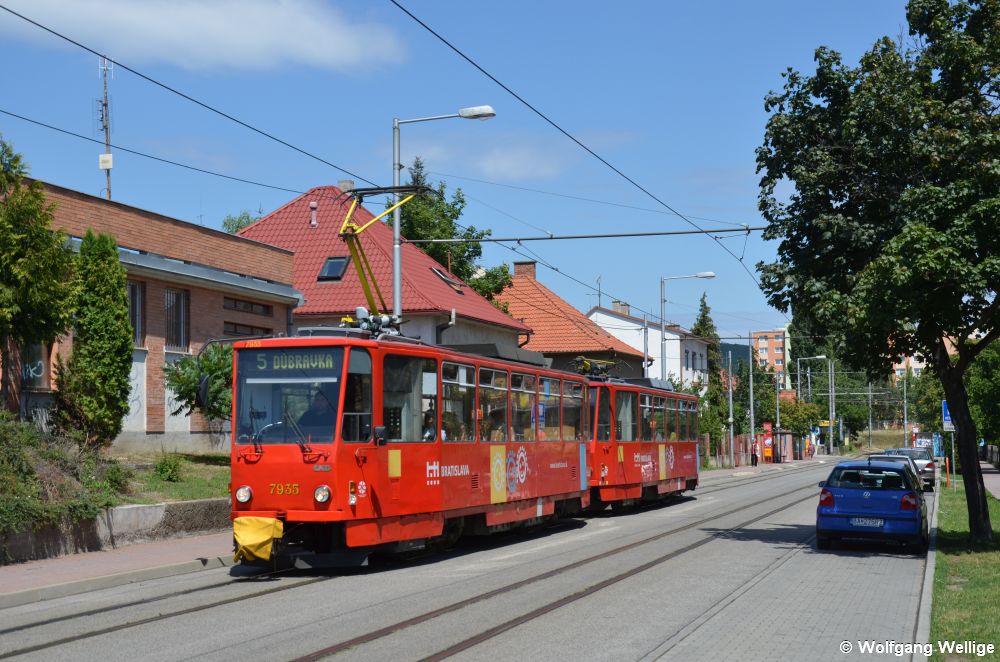 Der Tatra T6 Nummer 7935 hat am 22. Juli 2012 als Linie 5 gerade die Haltestelle Detvianska auf dem Streckenast nach Komisárky verlassen
