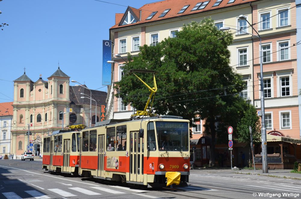 Wagen 7909 vom Typ Tatra T6 trägt noch die ursprüngliche Lackierung aller Tatra-Fahrzeuge, aufgenommen als Linie 5 hinter der Haltestelle Poštová (22.07.2012)