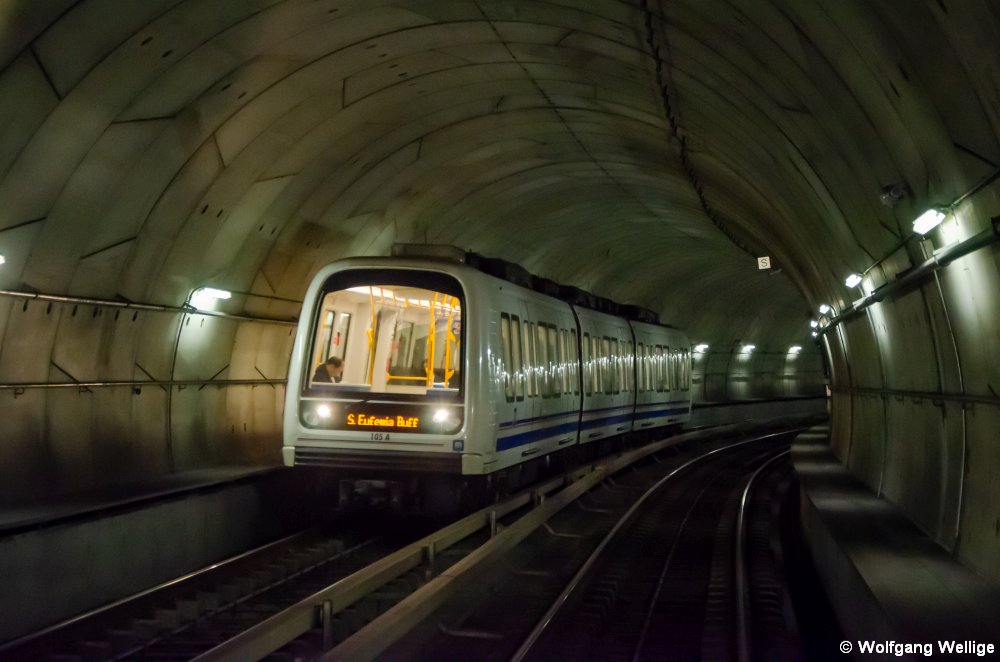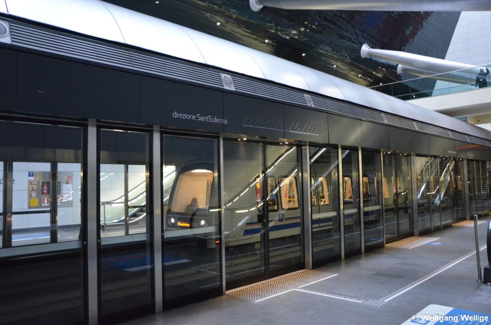 Die U-Bahnhöfe sind mit Bahnsteigtüren versehen und die Gleise oben überdeckelt, so dass keine Zugluft entsteht. Einige haben auch eine sehr interessante Architektur, wie die Station Bresciadue, in die am 17.02.2017 gerade Wagen 118 einfährt.