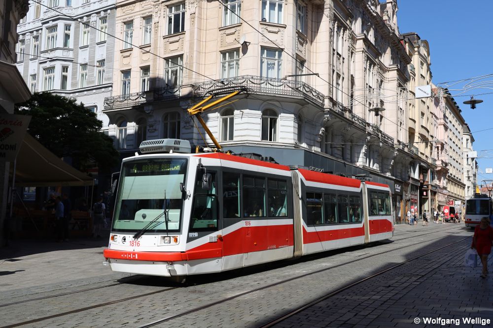Wagen 1816 des Typs 03T 'Anitra' von Škoda erreicht am 26.08.2020 gleich die Haltestelle Zelný trh. Von diesem Typ wurden in den Jahren 2003-2005 immerhin 17 Fahrzeuge gekauft.
