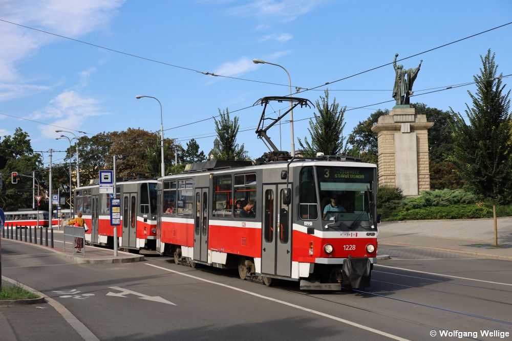 Der 1996 an die Prager Straßenbahn gelieferte und 2019 von dort übernommene Tatra T6A5 Nummer 1228 (Prager Nummer 8681) hat am 26.08.2020 gerade die Haltestelle Moravské náměstí verlassen