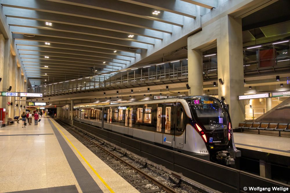 Seit 2020 sind die ersten Züge des Typs M7 von CAF bei der Brüsseler Metro im Einsatz. Das Foto von Zug 713 entstand am 19.06.2022 in der Station Schuman, an deren oberen Bahnsteig die InterCity-Züge Richtung Namur und einige Regionalzüge halten.