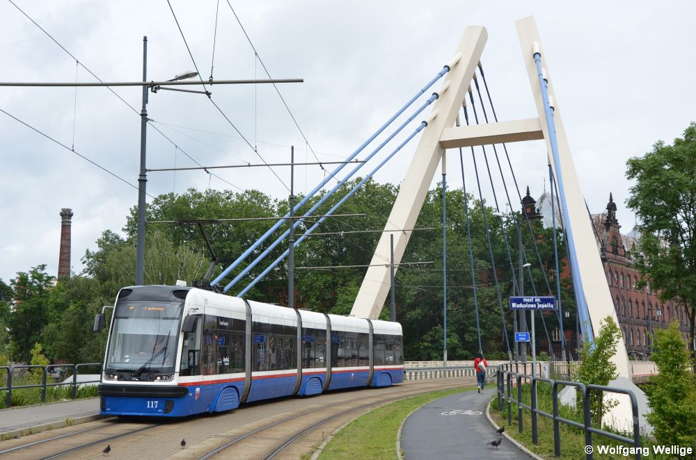 Der Pesa 'Swing' Nummer 117 überquert am 05.07.2017 auf einer futuristisch anmutenden, neu gebauten Straßenbahnbrücke hinter der Haltestelle Matejki den Fluss Brahe (polnisch: Brda).
