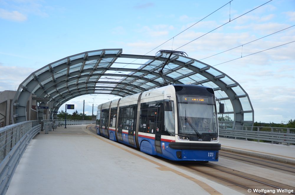 Wagen 121 verlässt am Abend des 4. Juli 2017 die umsteigefreundlich direkt über den Gleisen des Ostbahnhofs (Dworzec Wschód) angelegte Straßenbahnhaltestelle.