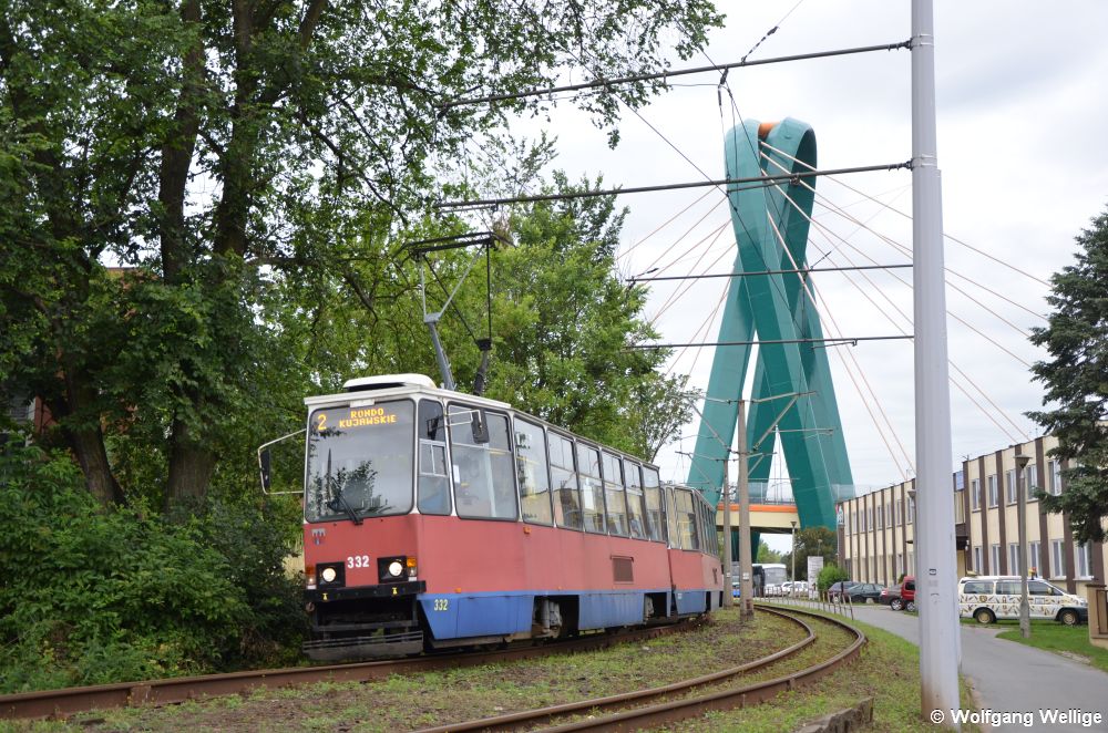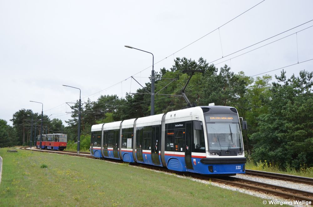 Im Januar 2016 wurde eine 9,5 Kilometer lange Überlandstrecke nach Fordon eröffnet, auf der Niederflurwagen 122 am 05.07.2017 nahe der Haltestelle Kleeberga gerade einem Konstal-Gespann begegnet ist.