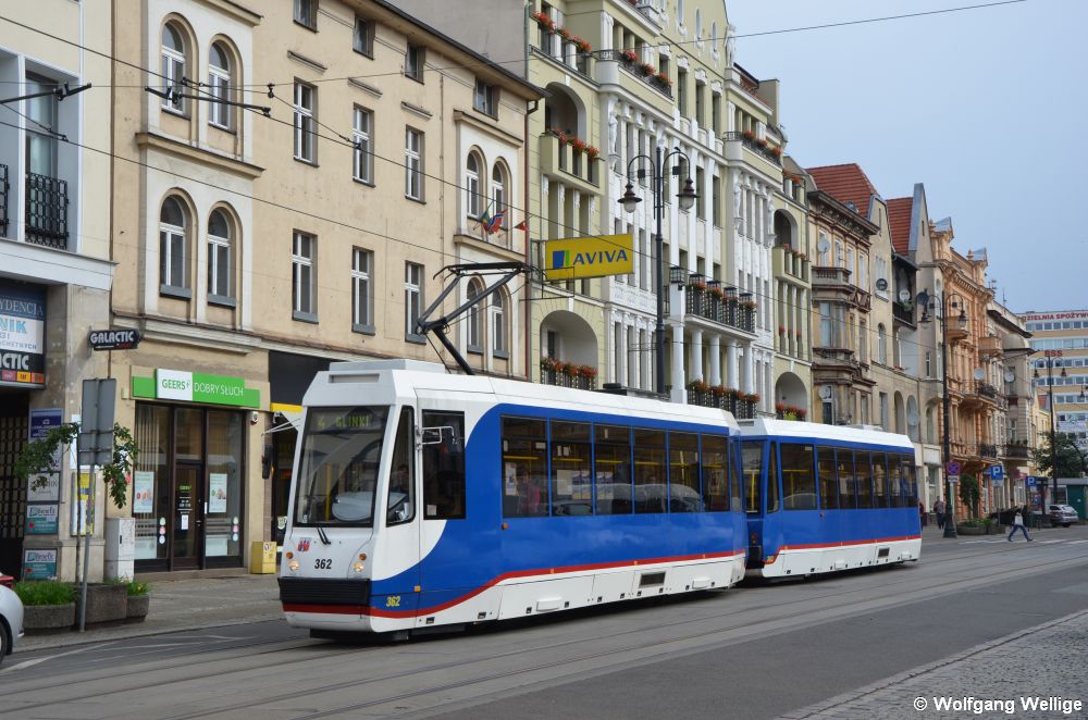 Der modernisierte Konstal 805Na Nummer 362 erreicht am 05.07.2017 gleich die Haltestelle Plac Wolnośki