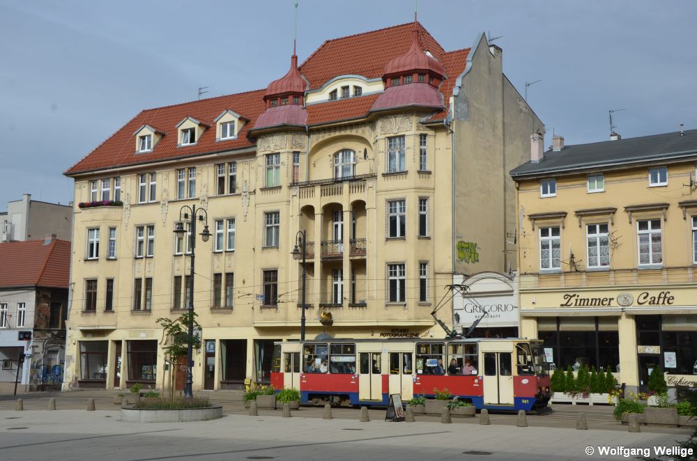 Die Farbgebung des Konstal 805Na-Triebwagens 361 harmoniert gut mit den Gebäuden nahe der Haltestelle Dworcowa (05.07.2017)