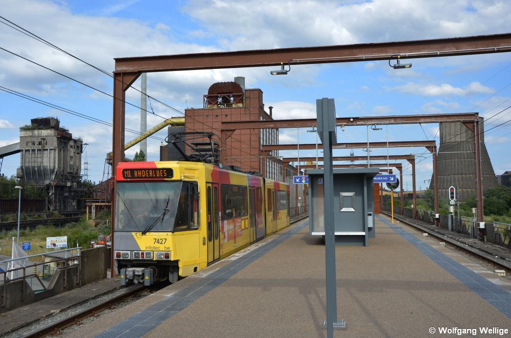In industriellem Umfeld befindet sich die Station Providence der in diesem Bereich als Hochbahn angelegten Strecke nach Anderlues (mit Wagen 7427 am 17.07.2018)