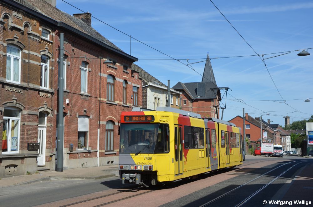 Die Linie M3 nach Gosselies ist eine klassische Straßenbahnstrecke, die den U-Bahn-Wahn in Charleroi nur deshalb überstand, weil sie die einzige Anbindung an den Betriebshof ist: Am 18. Juli 2018 ist Wagen 7409 nahe der Haltestelle Saint-Antoine unterwegs Richtung Innenstadt.