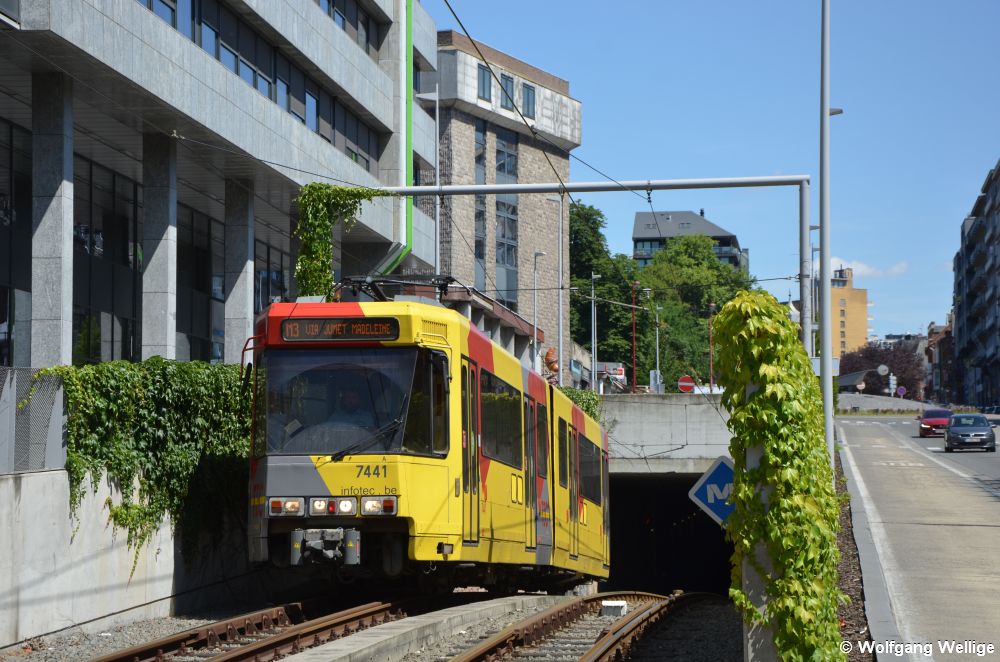 Wagen 7441 der Stadtbahn Charleroi verlässt am 18.07.2018 den 'Premetro'-Tunnel kurz vor der Station Tirou
