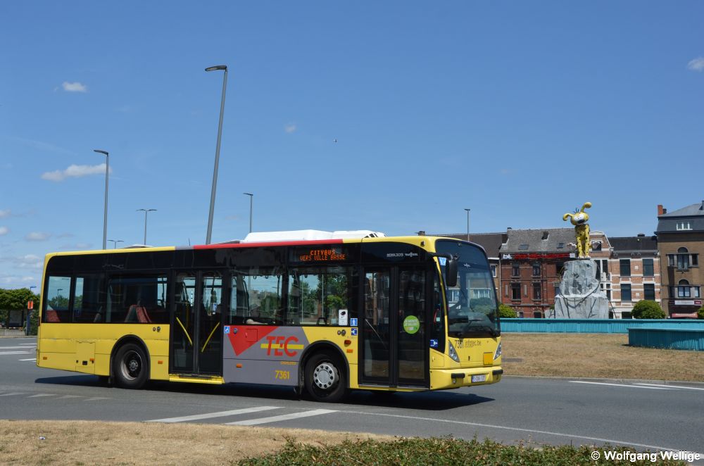 Stadtbus 7361 passiert am 18.07.2018 den Marsupilami-Platz, in dessen Mitte ein Denkmal der gleichnamigen Comicfigur steht, nahe der Metrostation Waterloo.