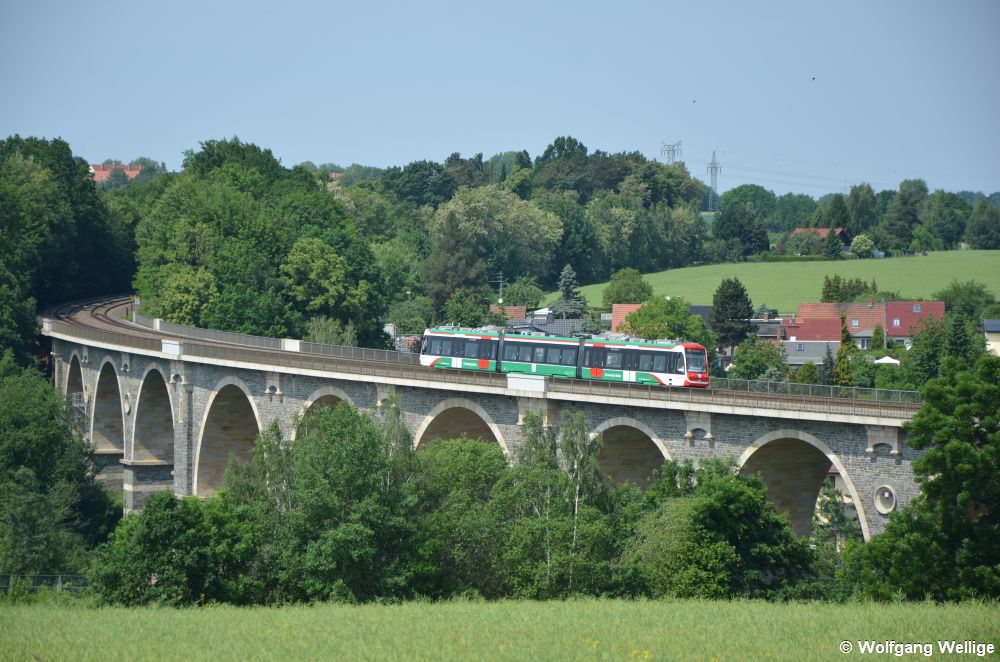 Zweisystem-Straßenbahnwagen 690 442 befährt am 27.05.2018 als ChemnitzBahn-Linie C13 den Bahrebachmühlenviadukt im Chemnitzer Stadtteil Borna