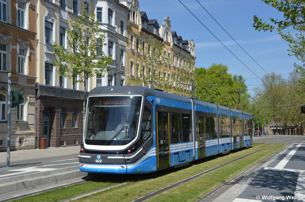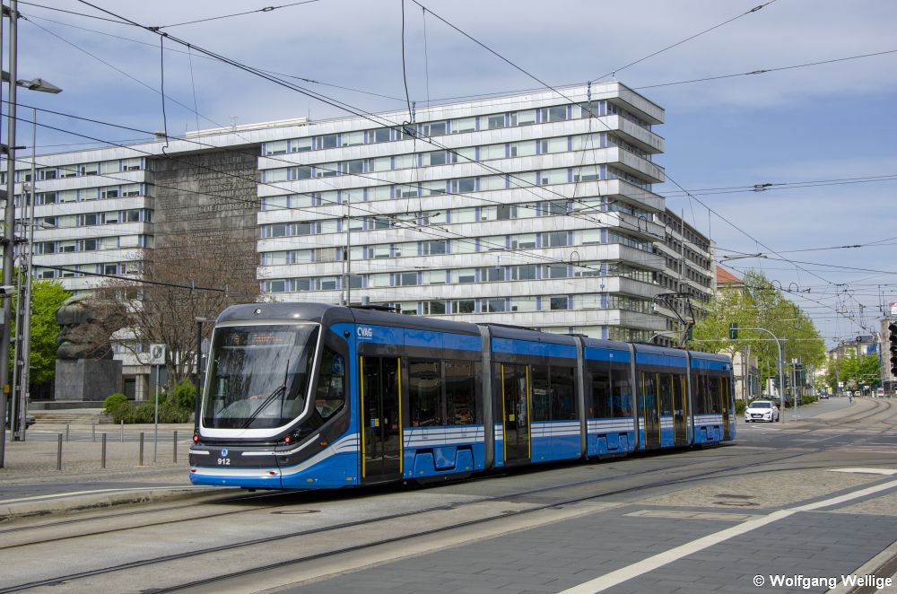 Seit Herbst 2019 sind in Chemnitz die ersten von 14 Fahrzeugen des Typs 'ForCity Classic' (35T) im Einsatz, die vom tschechischen Hersteller Škoda gebaut wurden. Am 8. Mai 2020 fährt Wagen 912 als Linie 5 auf die Haltestelle Nürnberger Straße zu.