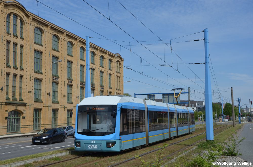 Vor der Alten Fabrik in der Zwickauer Straße hat Variobahn 604 am 8. Mai 2020 gerade die Haltestelle Industriemuseum hinter sich gelassen