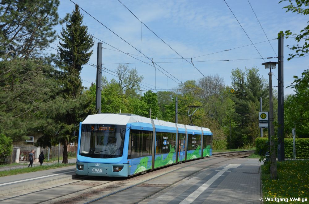 Variobahn 612 fährt am 8. Mai 2020 in die Haltestelle Arthur-Strobel-Straße ein