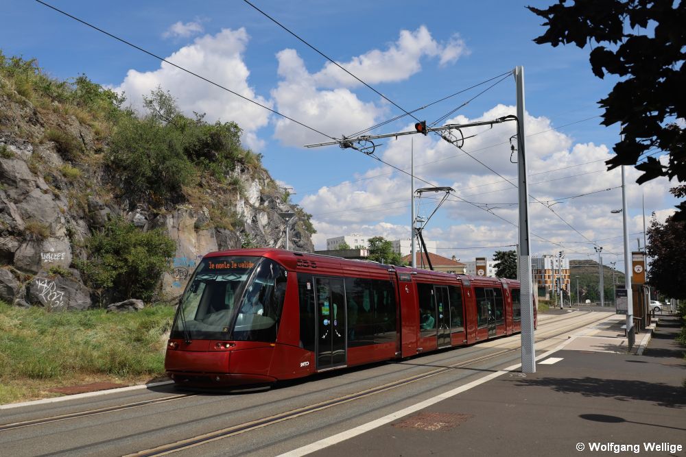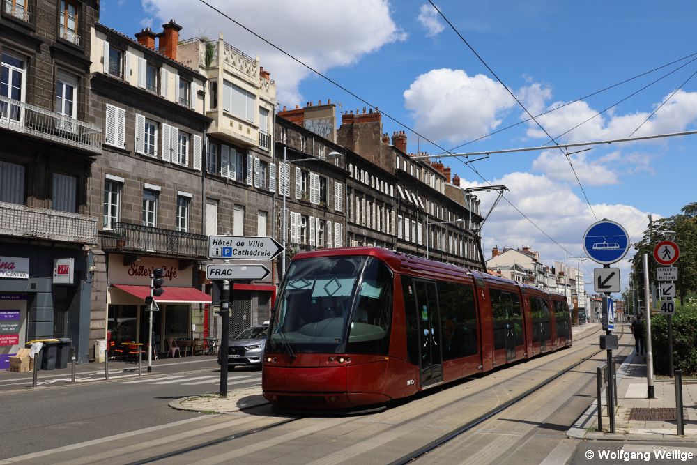 Die Tram Clermont-Ferrand wird mit per mittiger Schiene geführten, vierteiligen Translohr-Fahrzeugen des Typs STE 4 betrieben. Am 4.8.2020 hat Wagen Nummer 2 gerade die Station Hôtel de Ville (Rathaus) verlassen.
