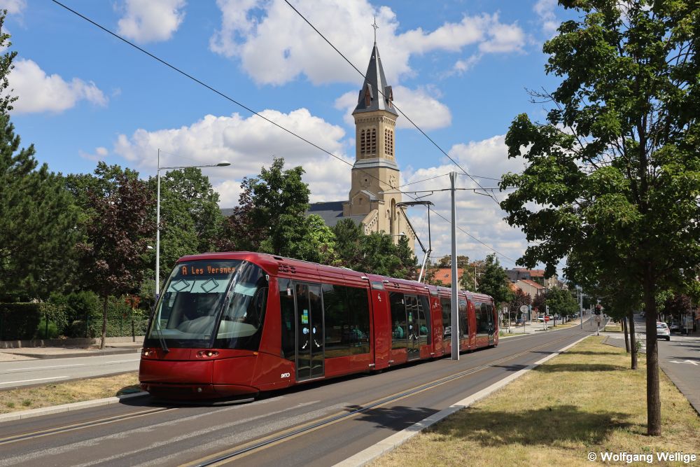 Wagen 17 der Translohr-Tram in Clermont-Ferrand fährt am 4. August 2020 auf die Haltestelle St. Jacques Loucheur zu, im Hintergrund ist die Église Saint-Jacques le Majeur.