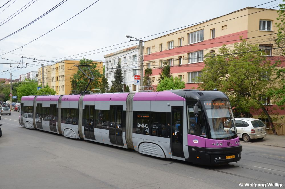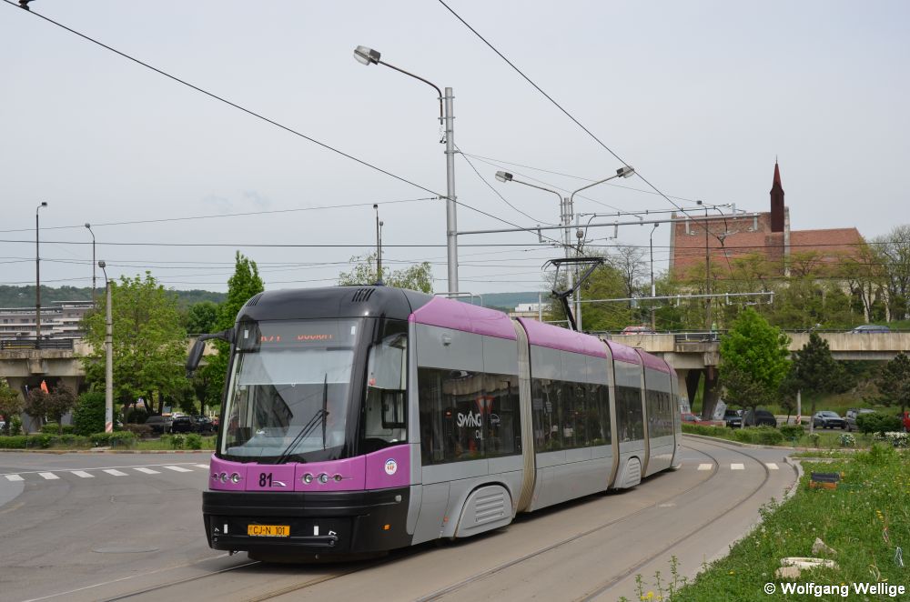 Vier Wagen des Typs Swing des polnischen Herstellers Pesa wurden nach Cluj geliefert. Wagen 81 hat am 30.04.2014 als Linie 101 gerade die Haltestelle Clăbucet verlassen.
