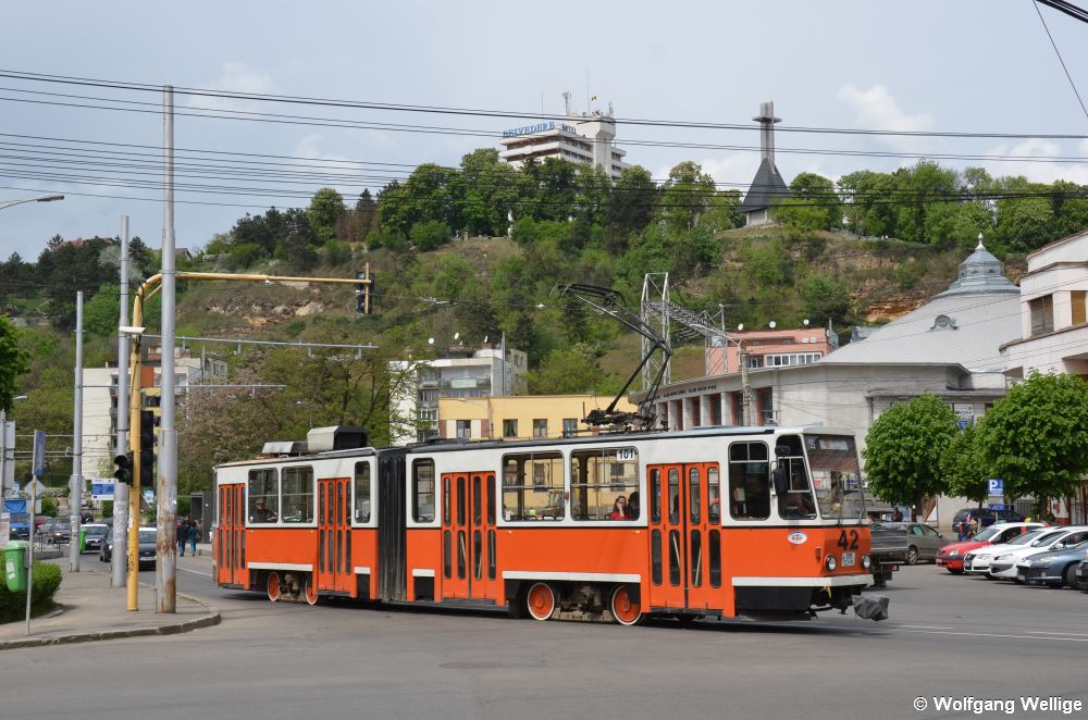Der ex-Berliner Wagen 42 hat am 30.04.2014 als Linie 101 zum Bahnhof gerade die Haltestelle Emil Isac verlassen, im Hintergrund ist auf dem Berg das 'Monumentul Eroii Neamului' (Heldendenkmal) zu erkennen.