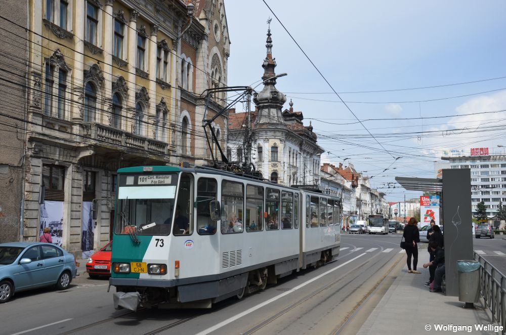 Der vom Verkehrsbetrieb Potsdam übernommene Wagen 73 passiert am 30. April 2014 an der Station George Bariţiu gerade die Haltestelleninsel der Gegenrichtung